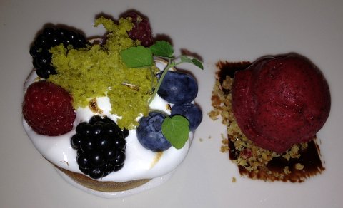 A tarte with summer berries and black currant ice cream. Good taste and textures, and good pairing with a late-harvest verduzzo from Friuli. 8/10