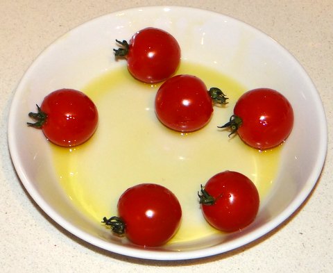 Preheat the oven to 175C/350F. Toss cherry tomatoes with 1 Tbsp olive oil in a small baking dish.