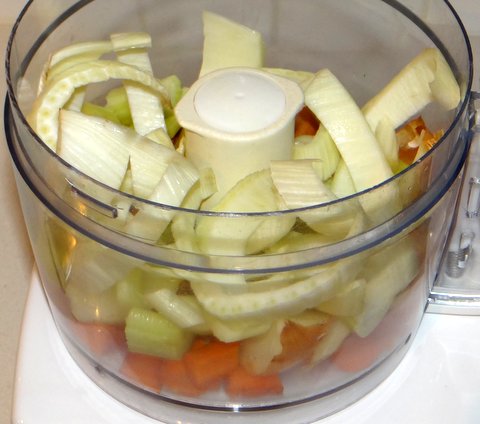 Chop the vegetables for the stock. I like to use the food processor for this. Chopping the vegetables speeds up the extraction of flavor for the stock. There is no need to peel the onion first.