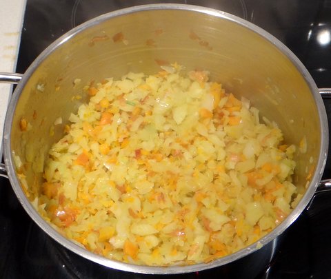 Sauté the chopped vegetables in olive oil until golden for additional flavor in your stock.