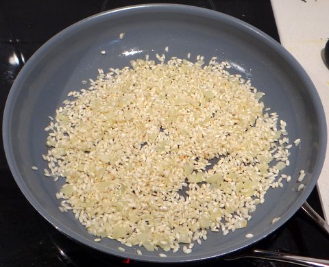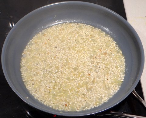 Add the rice and toast until the edges are translucent and the rice is very hot.