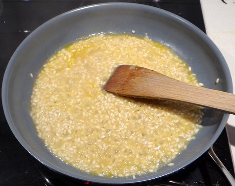 Add simmering vegetable stock one ladle at a time and keep stirring the rice over medium heat until you have used up all the stock and the rice is al dente, 16 to 18 minutes. You can use hot water if you run out of stock before the rice is cooked to your liking.