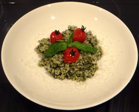 This basil risotto was inspired by a similar risotto we got at a recent dinner at restaurant Bussia in Amsterdam. Their version was lighter and greener, but this was just as delicious. The lighter and greener style may in part have been to blanching the basil leaves to set the color and lighten the taste, something I did not do and may try next time.