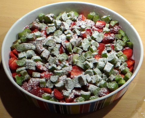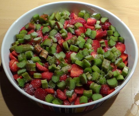 Cut the rhubarb into 1 cm (1/3 inch) slices. Rinse and hull the strawberries and cut them into halves or quarters. Put rhubarb and strawberries in an oven-proof pie dish and sprinkle with sugar.