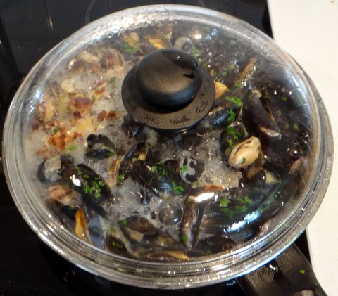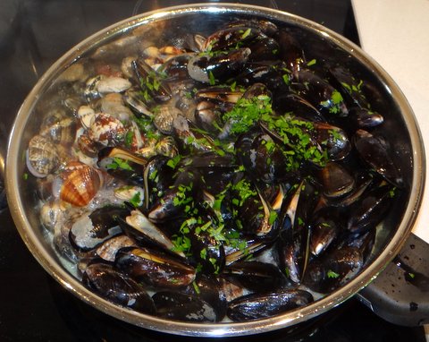 Take most of the meat out of the shells and discard the shells, but reserve some nice looking mussels and vongole for decoration.