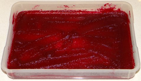 I made a layer of the agar agar-beetroot puree in a flat plastic container. Since I was using beetroot puree rather than beetroot juice, it was impossible to make a very smooth layer. I used about a quarter of the beetroot puree for one layer, so I had to repeat these steps four times.