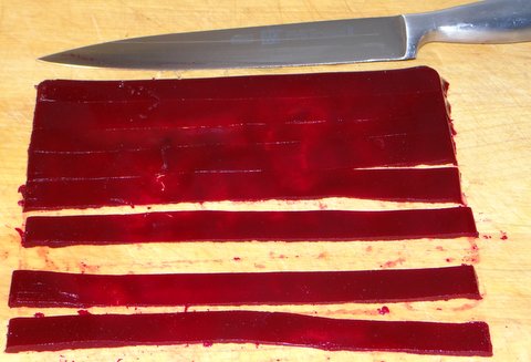 I put the sheet of beetroot jelly on a cutting board.