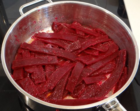 I set just by letting it cool. I used a dough scraper to remove the sheet of beetroot jelly from the plastic container.