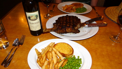 We ordered the 32 oz (900 grams) bone-in rib eye dinner for two and a bottle of Napa cabernet sauvignon. (You could also order this for one, but it is definitely enough for two.) There were four different cabs to choose from on the winelist. Our server could not tell us the difference between them, and the manager could tell us that they were all nice, but the more expensive one was nicer. So we picked one in the middle and it was fine.