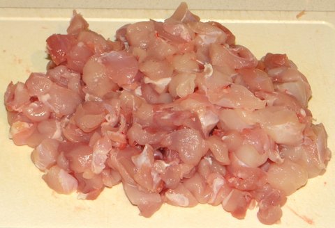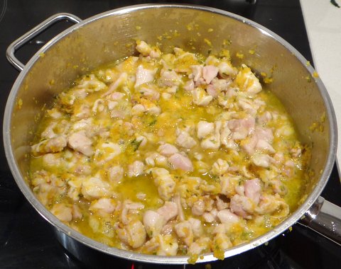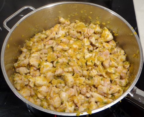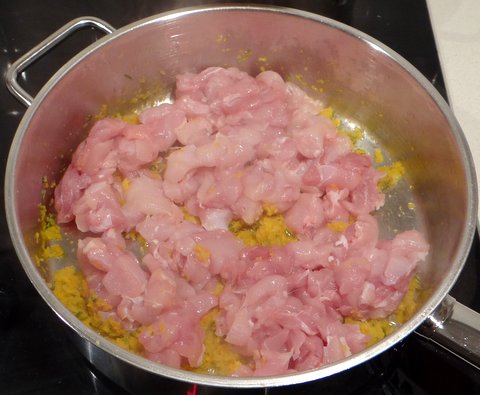 Sauté the rabbit meat until the raw meat color has disappeared completely.