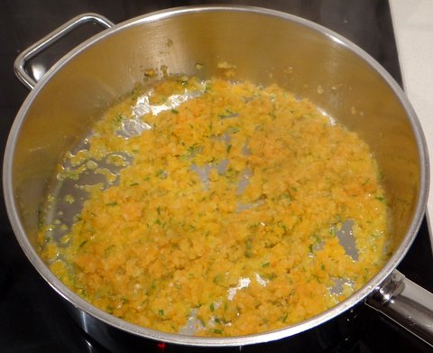 Sauté the carrot, onion, celery, and rosemary in the olive oil over medium heat until golden.