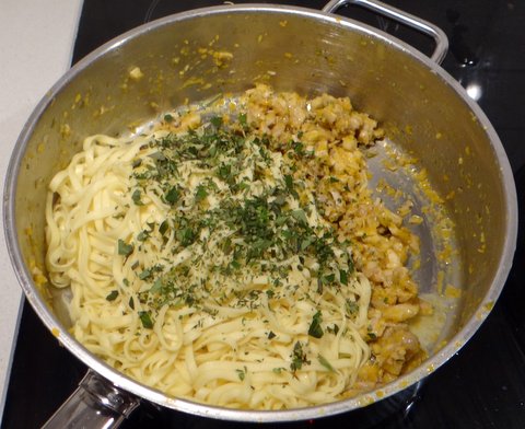 Cook the tajarin al dente in salted boiling water, which will only take a minute or so. Reserve some of the pasta water if the sauce is a little dry. Add the drained pasta to the sauce with the thyme and oregano.