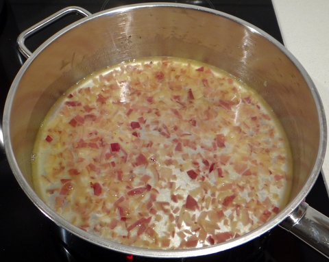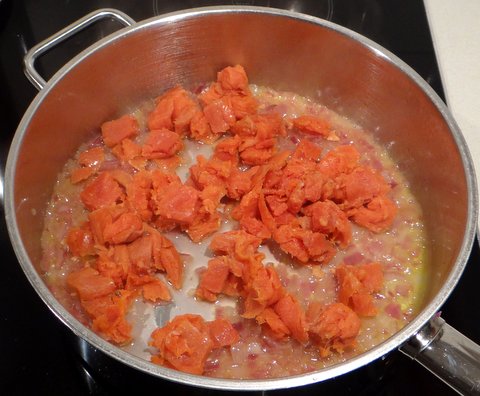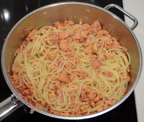 Add the salmon to the onions about 1 minute before the pasta is ready.