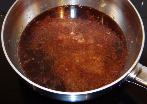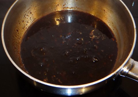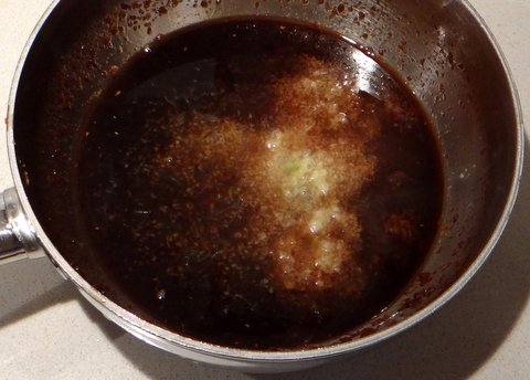 Put the soy sauce, red wine, mirin, brown sugar, garlic, and 3/4 of the ginger in a sauce pan.