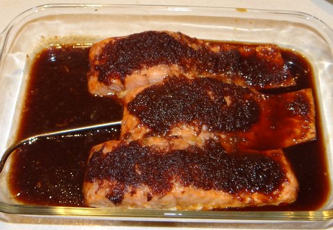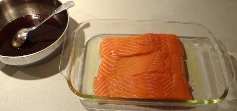 Cover the top of the salmon with 3 Tbsp of the glaze and let marinate for 5 minutes.