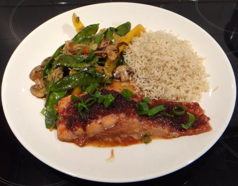 Fellow food blogger Meatballs & Milkshakes is a good source for reliable recipes. And so I was intrigued a while ago when I saw a recipe for Ginger Glazed Salmon that she called her favorite salmon recipe, and is basically salmon teriyaki with the addition of ginger and sake substituted by red (?!) wine. But since I trust M&M I decided to give it a try anyway and I was glad I did, because it was great! Not only is the sauce very good, also the way of cooking the salmon medium rare in a low oven is given sous-vide results without actually using sous-vide equipment. I used a thermometer to get the texture just right (core temperature of 43C/110F, just like sous-vide). The texture is just amazing and just like sous-vide: very tender and juicy. A friend stayed over for dinner who hates fish, but he loved this Ginger Glazed Salmon, the first piece of salmon ever that he finished.