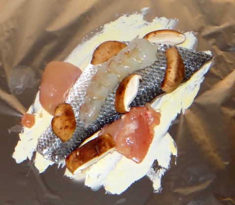 Arrange the fish (skin side up) with the shrimp and mushrooms on top and some chicken pieces around.
