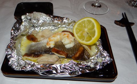 This is one of my favorite dishes from “Japanese Cooking: A Simple Art” that is surprisingly easy to make and absolutely delicious. As often in Japanese and Italian cooking, the key is in the quality of the ingredients. I used very fresh line-caught sea bass from the North Sea. You just wrap the ingredients in foil and cookt them in a hot oven for a bit, that’s all! It may not look like much in the photo, but you better believe me that the taste is outstanding. I adapted the recipe and made it even more simple, since there is no good reason to parboil the shrimp in advance.