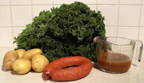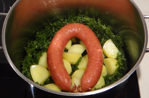 it starts of with baking onions in oil, than adding the Kale, spices, and broth to it, cook that for about 10 min. Than smoked pork loin and bacon is added and stewed together for 2-3 hours. After words a sausage similar to rookworst is added and heated up.