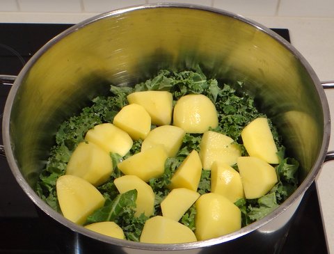 Put the kale into a large pot and put the potatoes on top. Add about 250 ml (1 cup) water and 1 tsp salt.