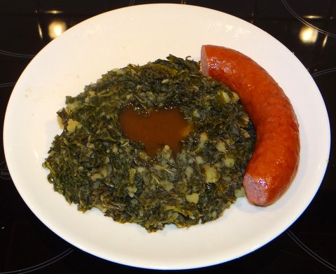 Serve with the gravy (traditionally served in a hole int he middle of the kale and potatoes, “kuiltje jus”) and the sausage.