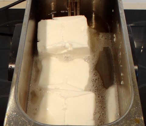 Start by heating the beef tallow. Beef tallow is solid at room temperature, so you will need to melt it first.