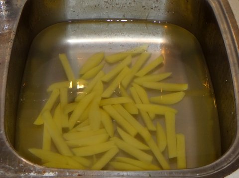 Let the potato sticks soak in cold water for 10 minutes or so to remove some of the starch.