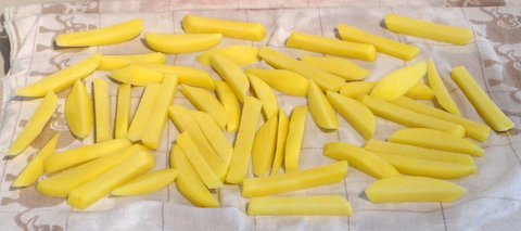 Peel the potatoes and cut into long sticks with a thickness of 1 cm (.4 inch) or a bit thicker if you like.