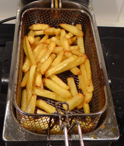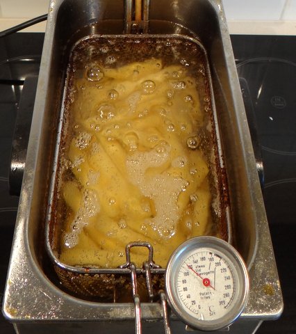 The other important ingredients is of course the potato. Floury potatoes (“kruimig”) are best for fries. Since they contain less water than waxy (“vastkokend”) potatoes, the fries will be more crunchy on the outside and more fluffy on the inside. Large potatoes will give you longer fries and are less work (less peeling for the same weight of fries). The sugar content of potatoes is lowest when they have just been harvested, and increases slowly while they are stored. The sugar content increases more quickly when potatoes are stored in a colder place (e.g. your refrigerator). Since a higher sugar level will make the fries brown faster, you will get lighter fries with new potatoes and browner fries with older potatoes or potatoes that have been stored in the refrigerator.