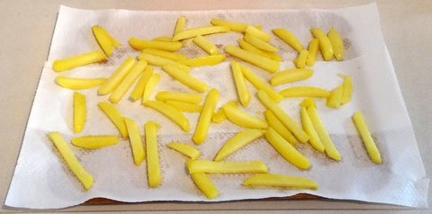 Here comes a very important step to obtain fries that are crispy on the outside and fluffy on the inside. Shake the fries well to remove as much of the fat as possible. Line a tray with paper towels, and spread out the fries. Let the fries cool to room temperature, and then refrigerate them for at least half an hour (or up to a day). The cooling and drying is important to make them crispy.