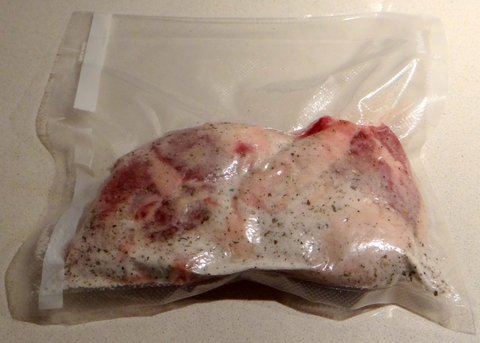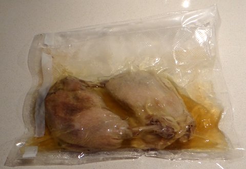 Then I sealed them into a vacuum pouch again, with a tablespoon of duck fat for each of the legs. (This duck fat was rendered from the duck breasts used for my recent duck breast experiment.)