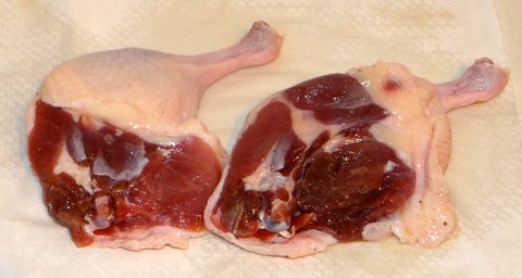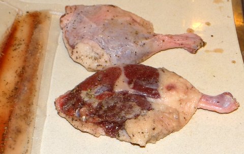 This is what the cured legs looked like after 10 hours. The salt had drawn out some of the juices, and had also penetrated the meat.