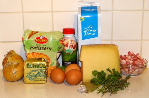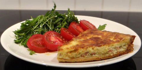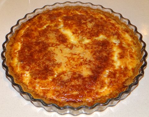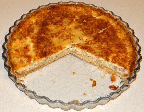 A quiche is a savory pie with a custard-based filling. Lorraine is a region in north-east France that has mixed German-French history and is called Lothringen in German. The word “quiche” comes from German “Küchen” (pie). According to wikipedia there are three types of quiche: Lorraine: with bacon (lardons) only, Vosgienne: with bacon and cheese, and Alsacienne: with bacon, onions and cheese. There is even a “Syndicat National de Défense et de Promotion de l’Authentique Quiche Lorraine” (National Society for the Protection and Promotion of the Authentic Quiche Lorraine) that says that an authentic Quiche Lorraine may only contain shortcrust pastry, egg, bacon, crême fraîche, pepper and nutmeg.