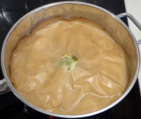 Make a parchment paper lid by cutting a circle of parchment paper that fits exactly into your pan.