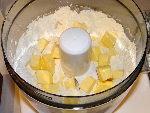 Use the ‘pulse’ until pea-sized pieces of butter remain. Drizzle with ice water.