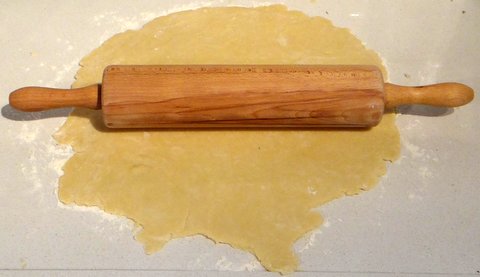 Roll out the dough to the size of your pie shape including the edges (so for a 23 cm pie shape with 2.5 cm edges, you need a circle with a diameter of 23 + 2.5 + 2.5 = 28 cm).