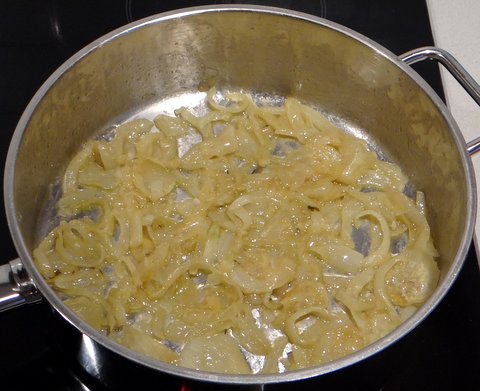 Cook the onion confit for two hours (!) over very low heat, stirring and checking every 20-30 minutes and adding a bit of water if needed. You don’t want the onions to caramelize, so the heat should really be very low and there should always be a bit of water left. (The presence of liquid water limits the temperature to 100C/212F, and caramelizing cannot happen at temperatures under 150C/300F. But as soon as the water is gone, such temperatures can be reached very quickly. So check periodically, a bit more often towards the end of the two hours.) The onions should become tender without falling apart.