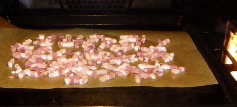 Take the bacon out of the oven and lower the oven temperature to 160C/325F.