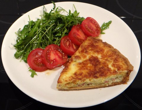 To serve, cut slices out of the quiche and reheat them at 190C/375F for 15 minutes.