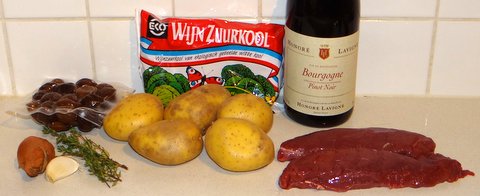 1. Thanks, Richard. If you can get venison, that is a pretty close substitute. The red wine only works with the sauerkraut if it has good acidity, so a pinot noir from a cold climate is excellent. Pinot noir is also made quite a bit in the German/French region where sauerkraut is eaten a lot.