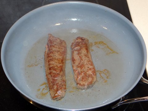 Put the loins in an oven dish and insert the probe of an instant-read thermometer into one of the loins (making sure that the tip of the probe is in the center of the loin). Cook in the oven at 80C/175F to a core temperature of 55C/131F. This will take about an hour. If you want it to go faster, you can use an oven as high as 175C/350F, but more of the outer edge of the meat will overcook that way and the meat will need to rest for 5-10 minutes after you take it out of the oven.