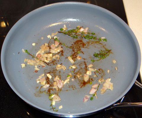 While the hare is cooking, add thyme, shallots, and garlic to the frying pan that you used to brown the hare and sauté over medium heat for a minute or so.