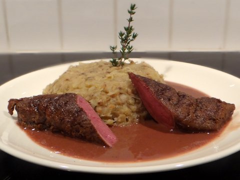 Serve the hare loin with the sauerkraut-chestnuts-mashed potatoes and the red wine sauce.