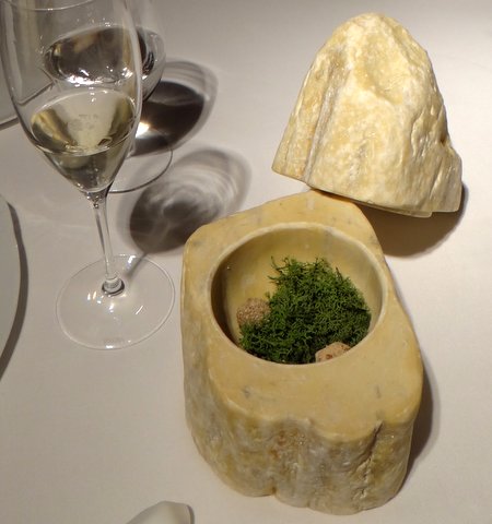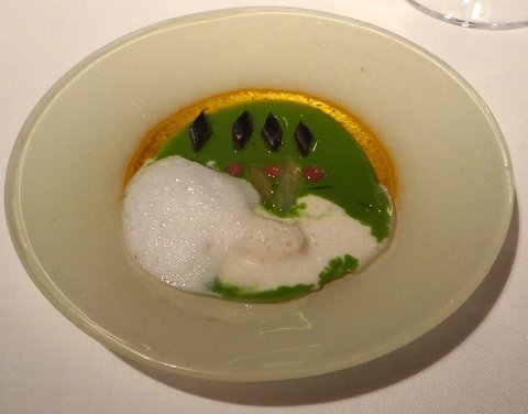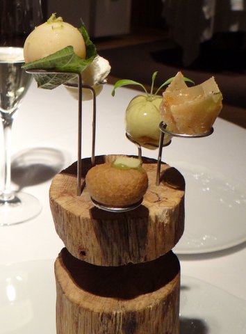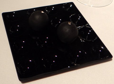 The first things you get are a glass of cava and a very nice bonsai olive tree with some great-tasting “caramelized” olives that you can eat from it. We have seen a presentation like this before, for example at Noma, and I don’t know who came up with it first, but it’s fun and the olives were really good with some crunchy iberico bacon and a very nice sweetness.