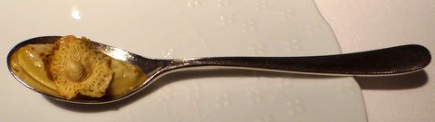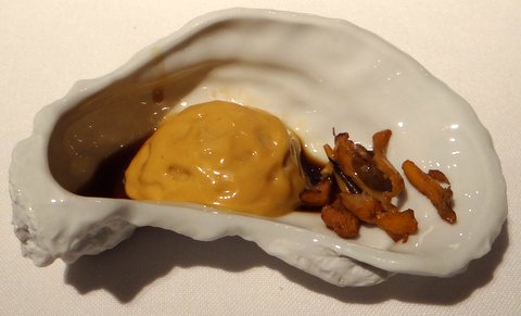 “Oyster with game meat hollandaise sauce.” I think this may be a translation error, as the oyster was served with mushrooms. The oyster was cooked (sous-vide?) and served with another dry sherry, this time La Bota de Amontillado No 37 Sanlúcar de Barrameda. Original presentation in an oyster ‘plate’. 8/10