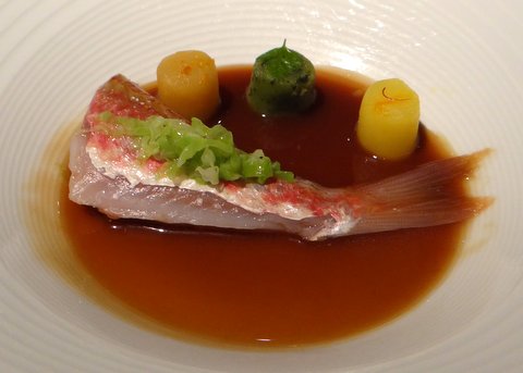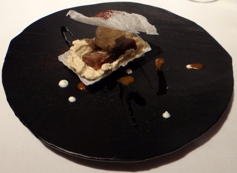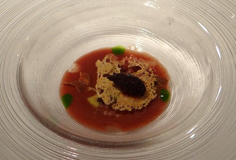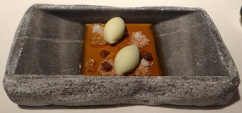 Red mullet cooked at a low temperature (again sous-vide). Served in a very tasty strong stock and three ‘gnocchi’ with different flavors. Paired with Carles Andreu 2010 Trepat from Conca de Barberà, a red wine from the local trepat grape. Red wine with fish is not a usual combination, but it worked very well. The fish was very tender and succulent. 10/10