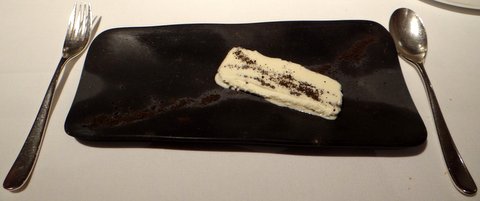 White asparagus Viennetta. I’m not sure if Viennetta is known around the world, but in Europe it is a cheap mass-produced frozen dessert of layers of vanilla ice cream and chocolate that does not even contain real chocolate. It is only the appearance that is copied here: it is white asparagus ice cream (!!!) with black truffle powder. The black truffle does not only make it look like Viennetta, it also goes very well with the asparagus ice cream. The ice cream has a delicious asparagus taste, but it is also sweet! And it gets even better: it was paired wonderfully with an off-dry Mosel Riesling Kabinett Weingut Joh.Jos.Prüm Wehlener Sonnenuhr 2007. Wow is all I can say. Original, funny, delicious and an amazing wine match. I think it’s silly to give 11/10, so 10/10 it is. This is definitely something that I’ll use as inspiration for a dish of my own.