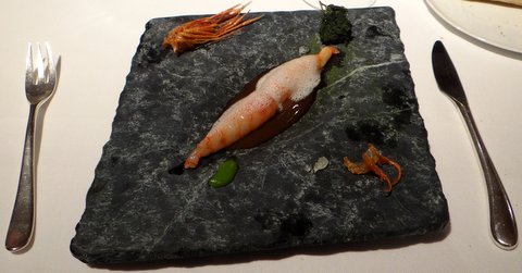 “A whole prawn”: charcoal-grilled king prawn, head juice with seaweeds, seawater and sponge cake of plankton. The ‘head juice’ was a very concentrated shrimp stock. The shrimp was very tender and the deep-fried shells were also very good with a very concentrated flavor and interesting crunchy texture. Good pairing with a Viña Tondonia 1997 white Rioja. The Rioja seemed a bit ‘old’ at first, but it came to life with the dish. 8/10