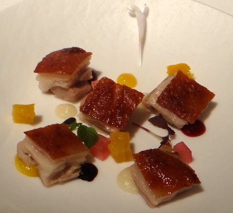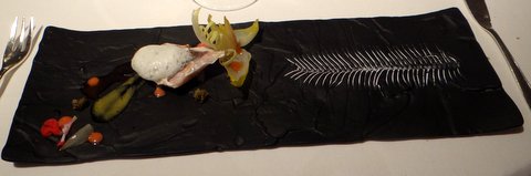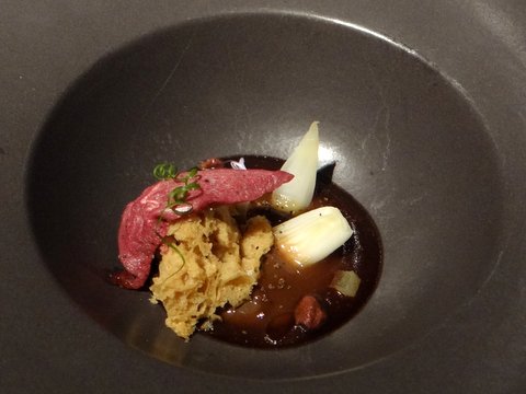Red sea bream with endive, gentian and citrus. Beautiful dish with a fish bone. The sea bream was cooked perfectly sous-vide, but also had a very nice charcoal flavor on the skin. I also liked the endive very much. Excellent pairing with a dry Tokaji 2007 from Oremus (known for sweet Tojaki), a very good and unusual wine. 9/10