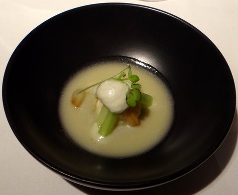 Salt-cod brandade: Braised salt cod tripe, salt-cod foam, olive-oil soup, shallots and honey, thyme and chili pepper, vegetable contrast. The vegetables (bok choy?) were indeed a nice crunchy contrast with the tender and flavorful fish. Another good pairing with a Spanish white from Priorat: Nelin 2008. 8/10